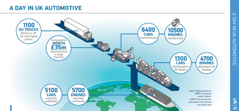 There are also the problems associated with Brexit, and a ‘no-deal’ Brexit in particular, for an industry heavily reliant on a continent-wide component supplier base. At least 10% of those employed in the GB automotive sector are from elsewhere in the EU. An extensive supplier base and the system of ‘just in time’ component delivery are possible only with the fiercest competition from across the European Union. The ‘just in time’ system brings in £35 million of parts each day to the assembly lines of British car manufacturers. These components have come from across the EU, a screw from here and a bolt from there, a zinc coated nut from Spain and a plastic plug from Poland. An intricate and polluting convoy of 1,100 trucks a day roll into Britain so that Tom Smith on his fork truck at Jaguar, Castle Brom, can drop a pallet of washers to Felix Jezniak, just as he tips his last washer from its oily box and affixes it to his 20th vehicle of the day. The vast, intricate and integrated system of supply is a wonder to behold, and if man could only apply himself to producing with such efficiency the things he needs for healthy enjoyable life rather than for the enrichment of a handful of shareholders then the world would be veritable Garden of Eden.